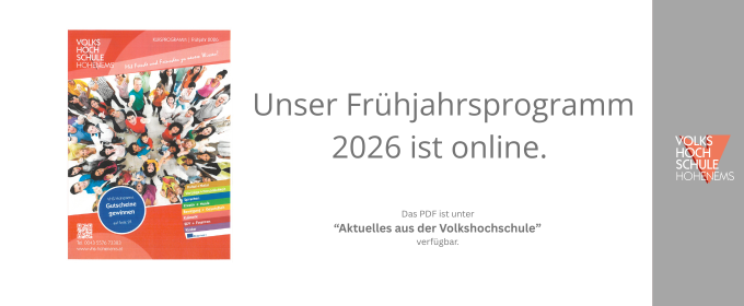 Frühjahrsprogramm 2026Wir wünschen Ihnen viel Spaß beim Durchblättern und freuen uns auf Ihre Anmeldung. weiterlesen